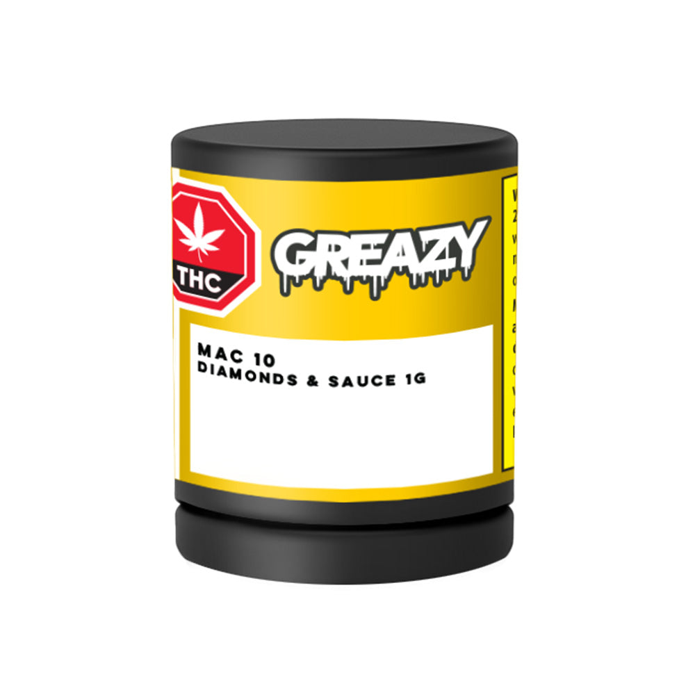 We're dialing it up! Greazy's Mac 10 Diamonds & Sauce features perfectly fragmented, crystal-clear THCa diamonds layered generously in saucy terpenes for an ultra-potent, clean, and elevated experience.